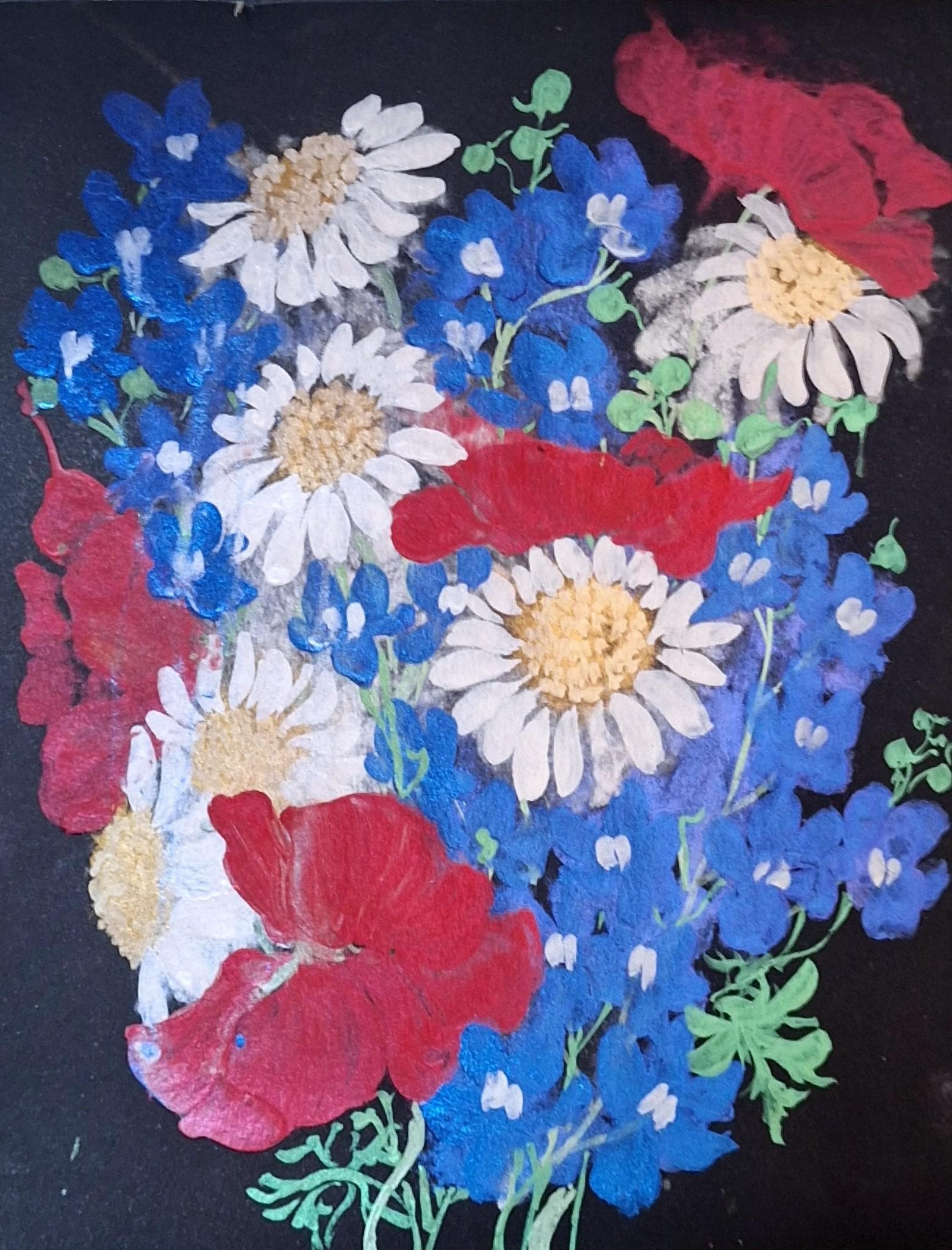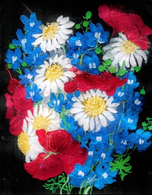 Red Poppies, Blue Butterfly Delphiniums, and Daisies